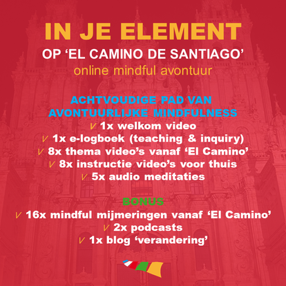Doorloop in je eigen tempo het achtvoudige pad van Mindfulness onderweg naar Santiago de Compostela. Met o.a. teachings vanaf El Camino en praktische oefeningen voor thuis.